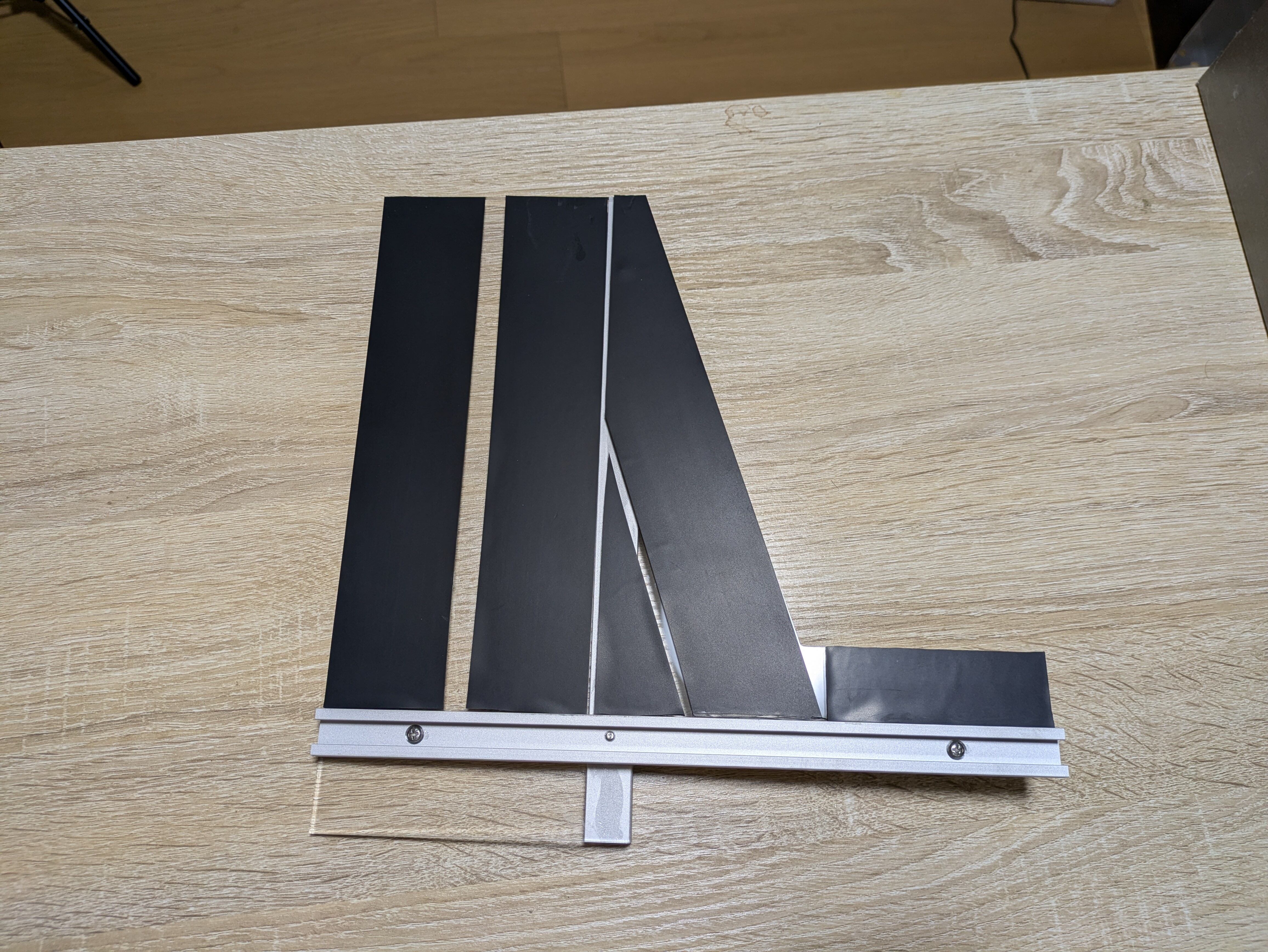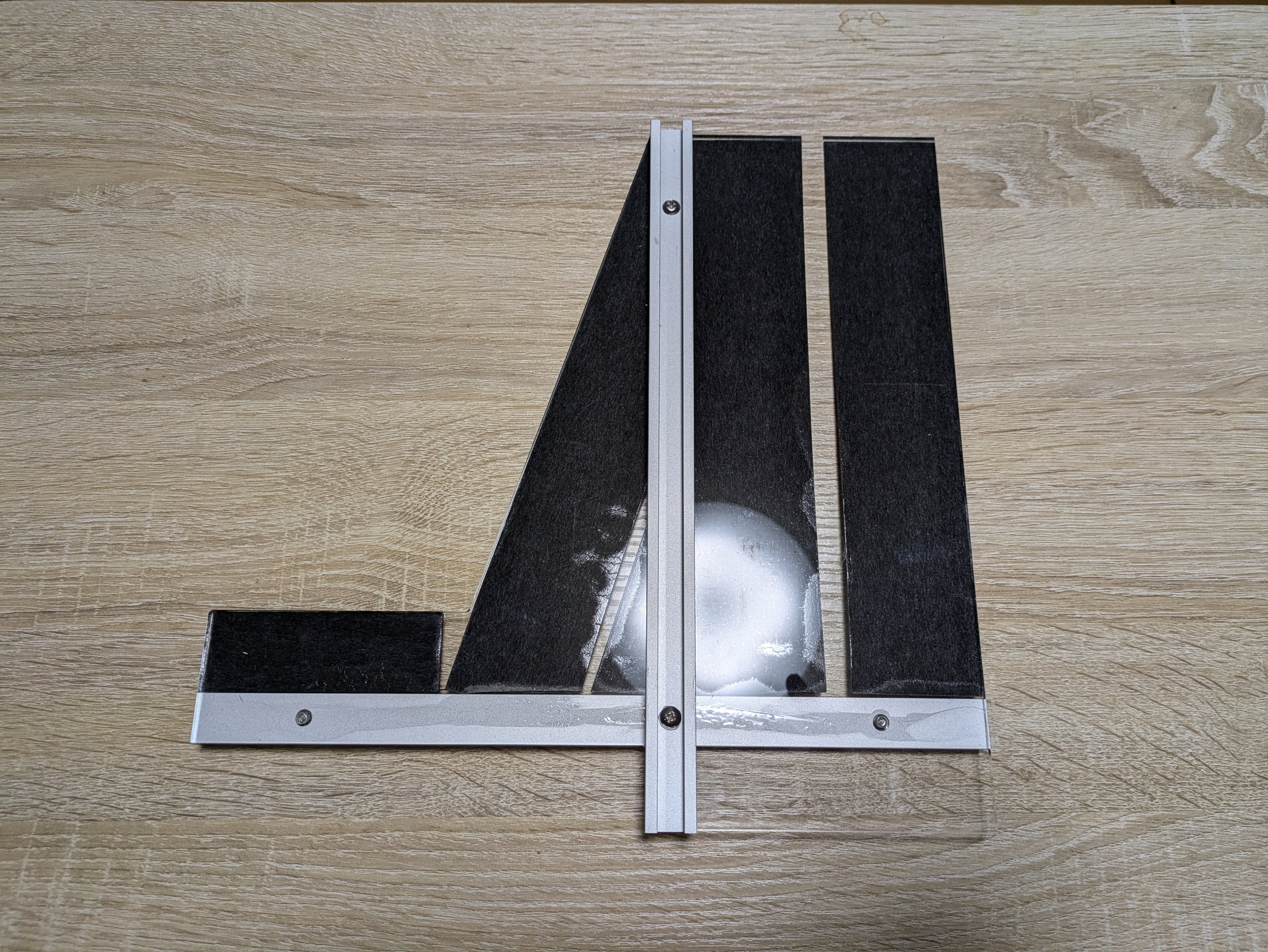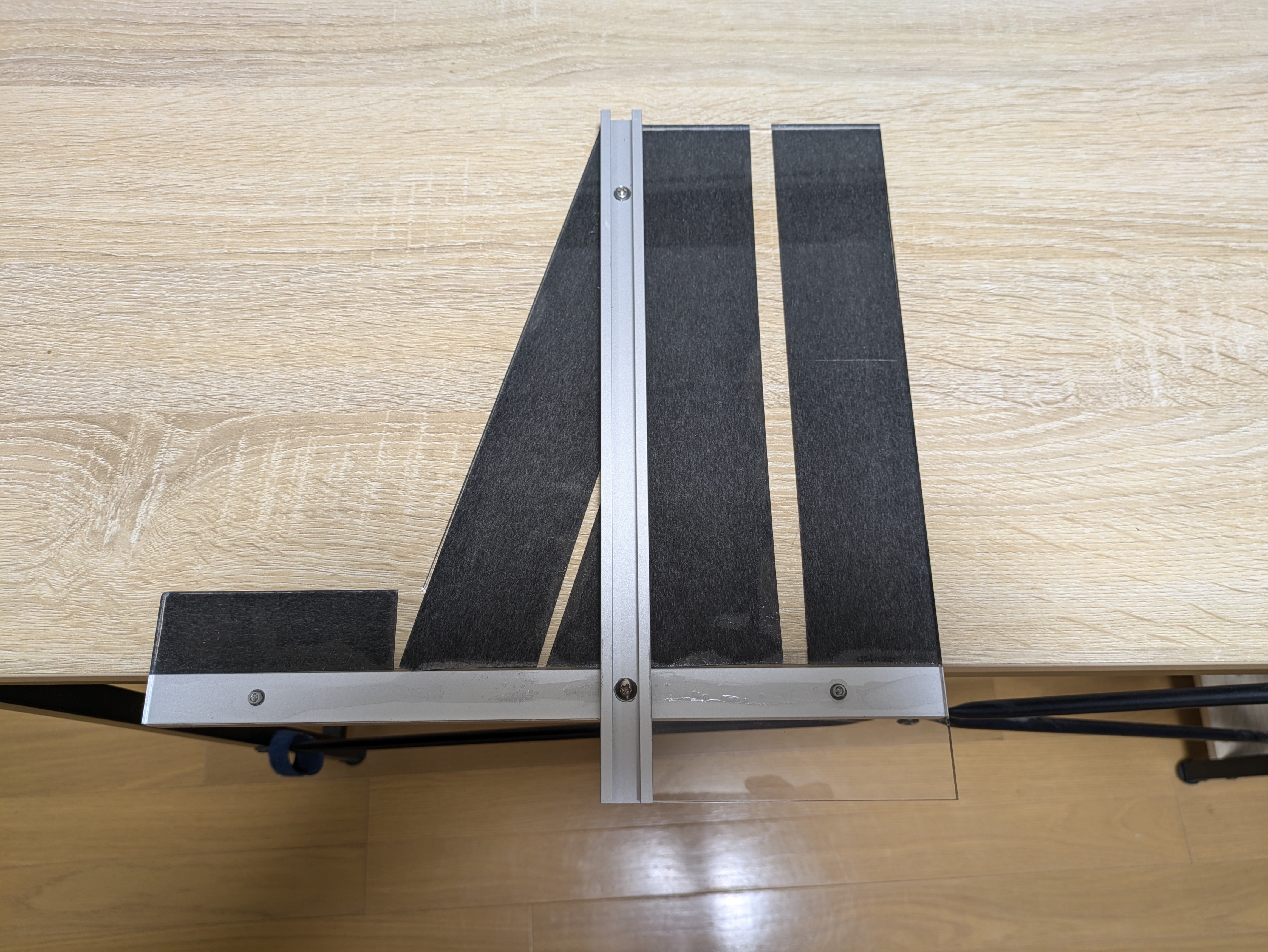 厚み5mmのアクリル板とTトラックレールで作った丸ノコ直角定規です。